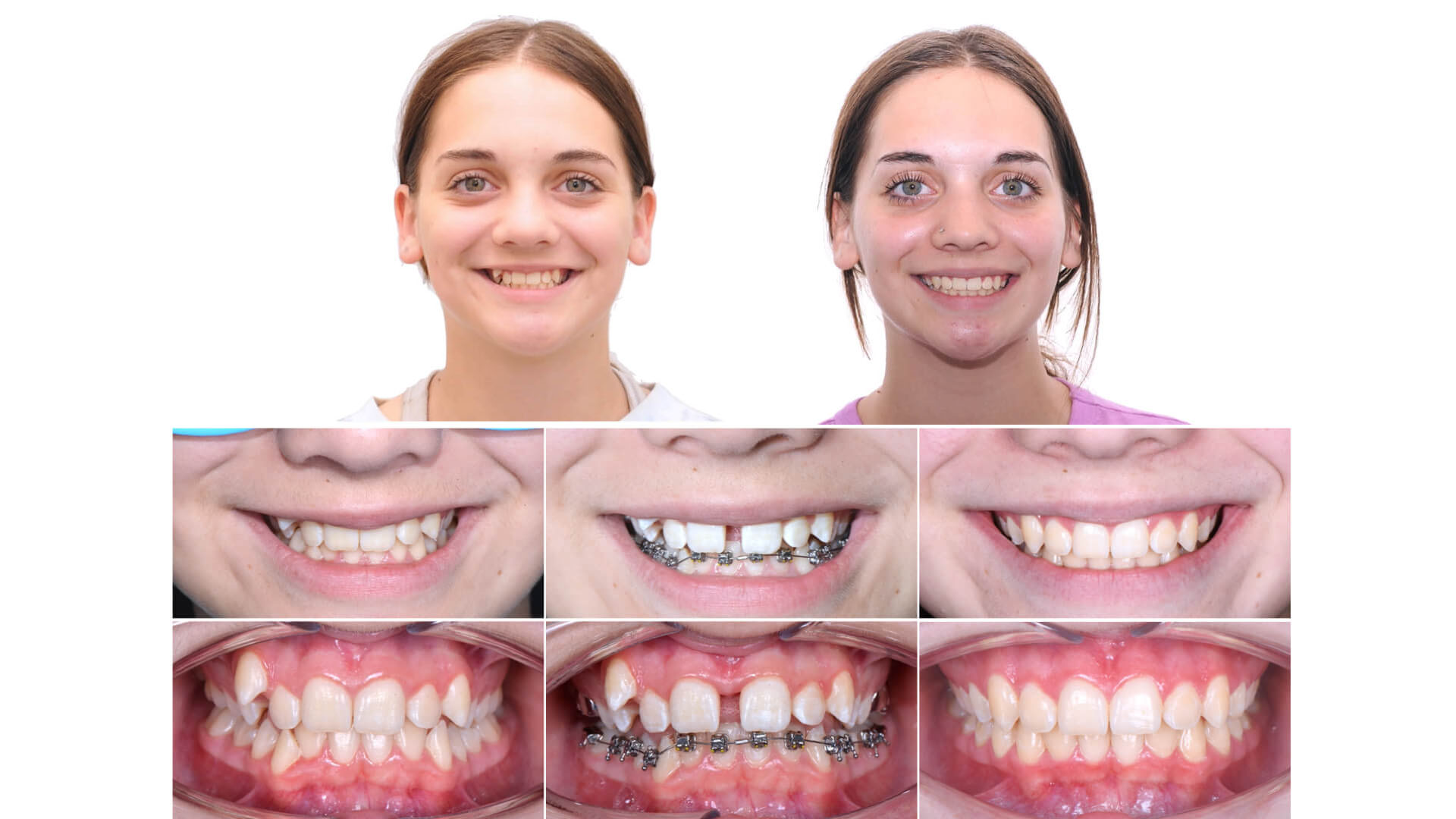12-year-old female Chief complaint: “I have a gap between upper and lower front teeth.” Initial: Mild crowding, anterior functional shift, excessive overbite and overjet with retained baby teeth Treatment: Braces